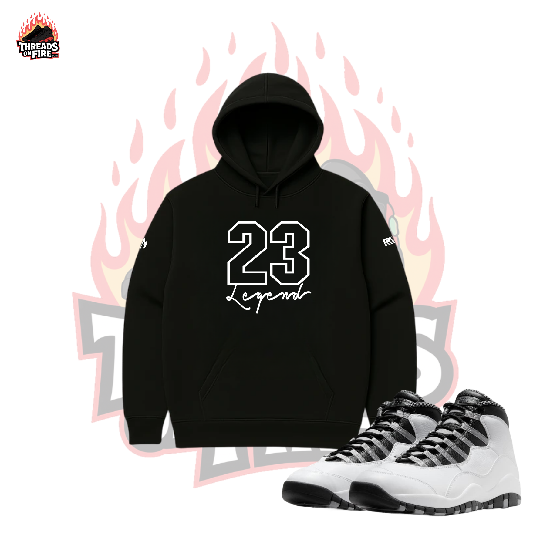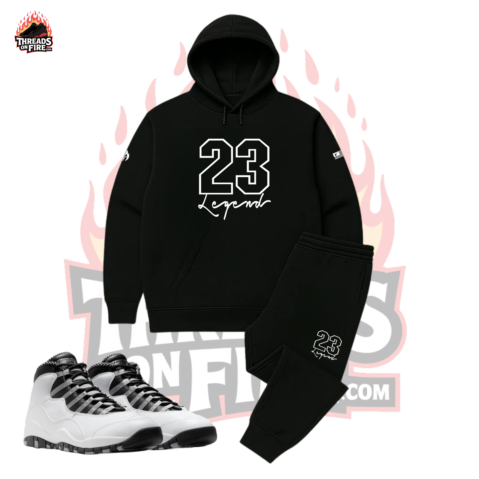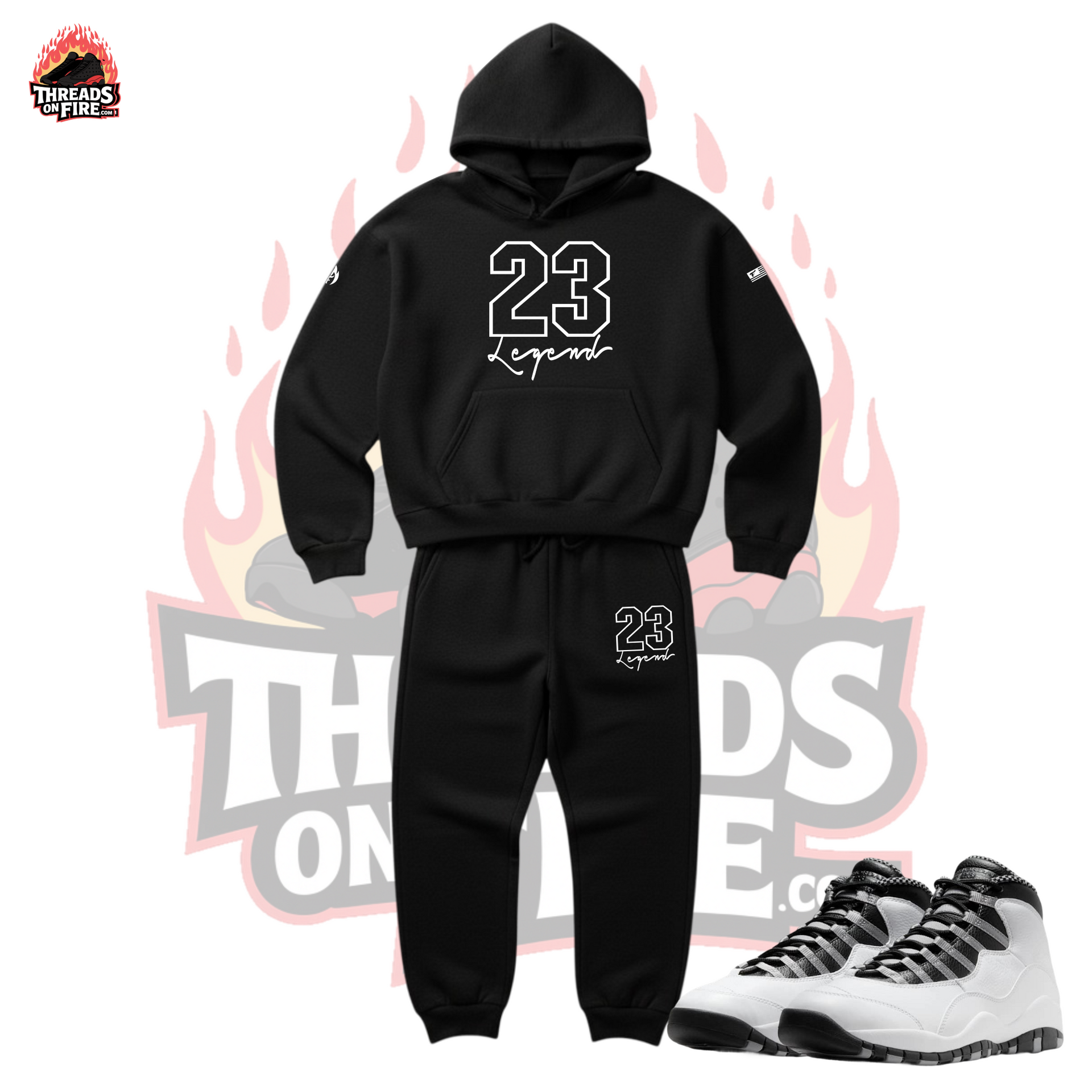 Men's 23 Legend Black Hoodie and Joggers Sweatsuit by Threads On Fire. Designed with “23” and “Legend” lettering, this heavyweight fleece set is made to perfectly match your Air Jordan 10 Steel sneakers.