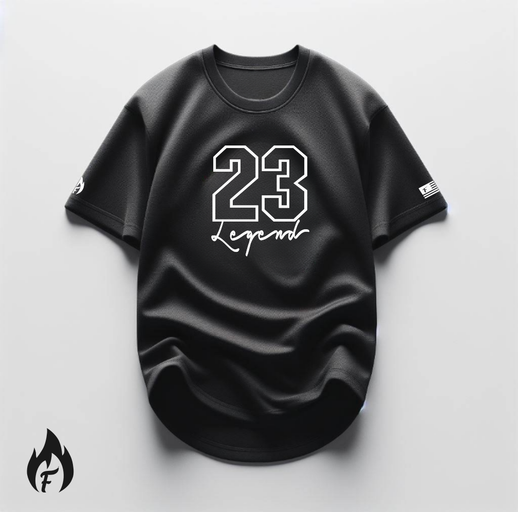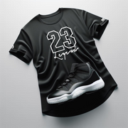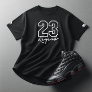 Upgrade your game with the "curved hem" 23 Legend Black Sneaker T-Shirt! Designed to match the iconic Air Jordan Retro, this curved hem black tee is a must-have for any sneakerhead. Featuring a bold black design with the iconic 23 Legend logo, this drop tail tee will elevate your style while showing off your love for the legendary Jordan brand. Don't miss out on this fire streetwear piece!🔥
