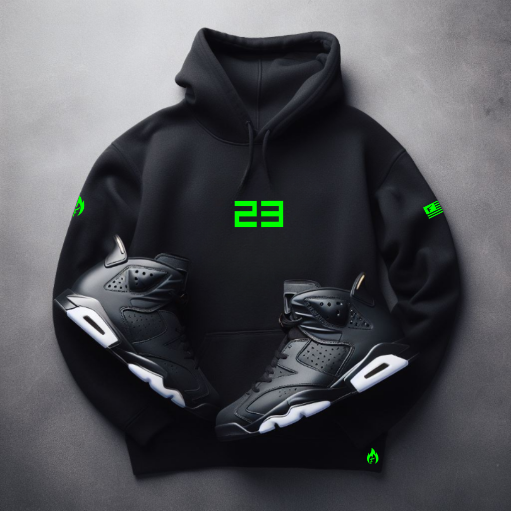 So why wait? Order now and step up your style game with our exclusive "23" sneaker hoodie to match Air Jordan 6 Retro's black and neon green colorways. With fast shipping times, hassle-free returns, and unbeatable customer service, there's never been a better time to upgrade and stay LIT!