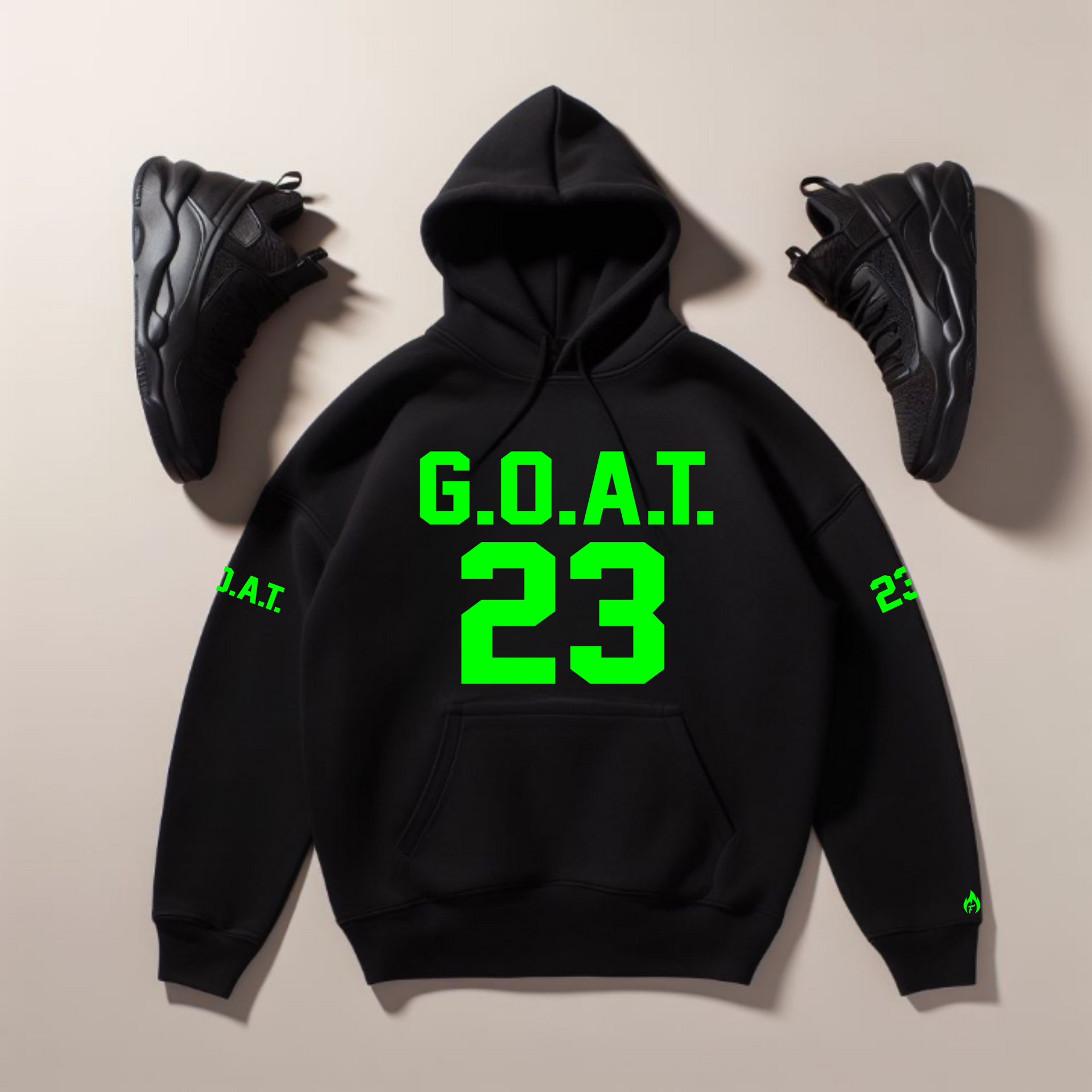 Upgrade your hoodie game with the GOAT 23 black and neon green sneaker hoodie. This sleek and stylish hoodie is a perfect choice for anyone looking to make a statement. The bold graphic on the front gives a nod to urban streetwear, while the soft and comfortable fabric ensures you'll want to wear it all the time.