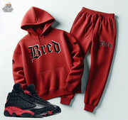 Check out our "23 Legend" Red Sneaker Sweatsuit To Match Air Jordan 13 Bred, colorway! Features a bold "23 Legend" sneakerhead graphics logo on the front in striking white color.