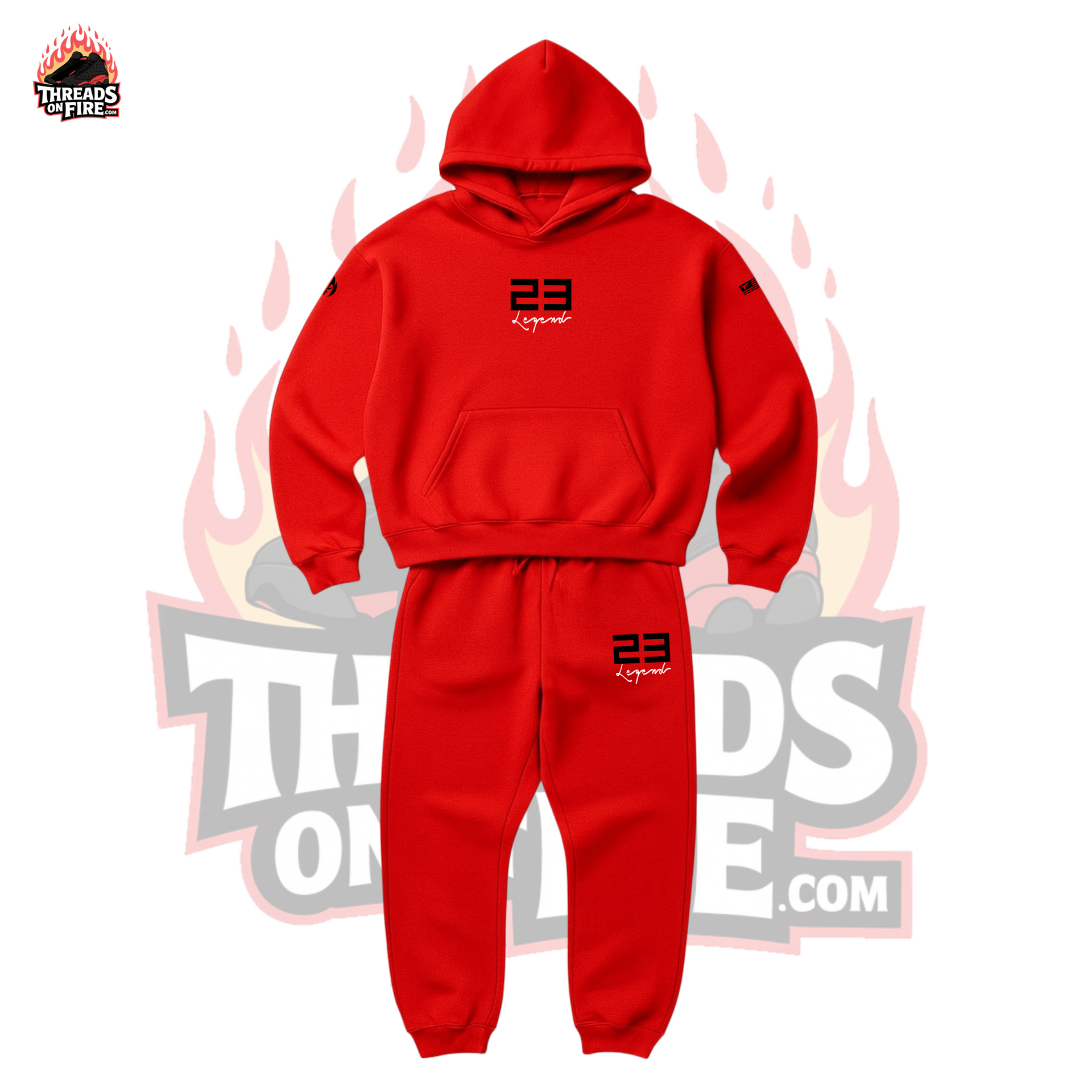 Check out our "23 Legend" Red Sweatsuit To Match Air Jordan red/black colorways! Features a bold "23 Legend" sneakerhead graphics logo on the front in striking color. With fast shipping, hassle-free returns, and on-point customer service, Threads On Fire is the only choice for real sneakerheads who demand the FIRE!